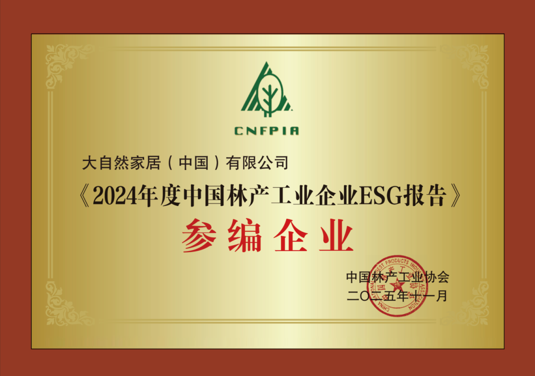 11 月 12 日,2025 全球飾面大會(huì)隆重召開,大自然家居應(yīng)邀參會(huì),與近千家名企共話行業(yè)發(fā)展趨勢(shì)、分享創(chuàng)新成果。會(huì)上,由中國(guó)林產(chǎn)工業(yè)協(xié)會(huì)主導(dǎo)的《2024 年度中國(guó)林產(chǎn)工業(yè)企業(yè)ESG報(bào)告》正式發(fā)布,大自然家居憑借突出貢獻(xiàn)獲頒參編證書,并在會(huì)上同步推出《大自然家居 2024 年社會(huì)責(zé)任報(bào)告》,全面展現(xiàn)企業(yè)在綠色發(fā)展、社會(huì)責(zé)任等領(lǐng)域的實(shí)踐與成效。